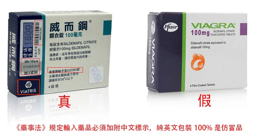 • 台灣合法威而鋼的包裝 LOGO 為 VIATRIS(中文名:晖致),而非 Pfizer