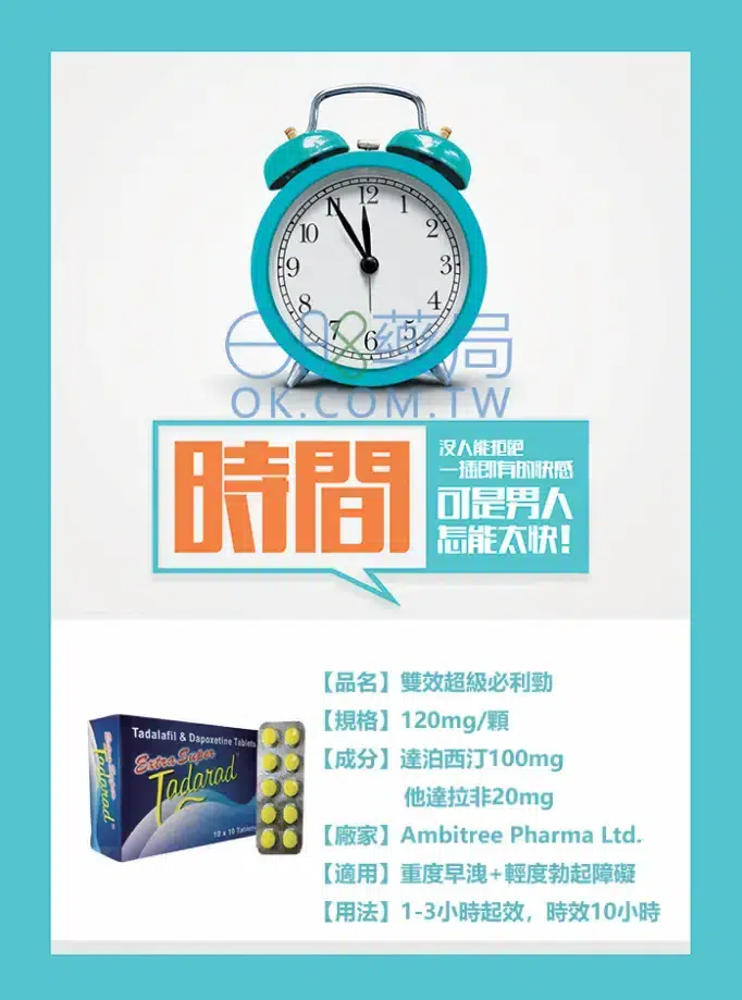 超級必利勁是一款雙效藥物,結合了達泊西汀和他達拉非這兩種活性成分。達泊西汀主要用於延遲射精,幫助男性更好地控制射精時間,從而有效治療早洩。而他達拉非則是常見的治療勃起功能障礙的藥物,能夠增強勃起硬度,讓男性在性愛中表現更加自信。這兩者的強效結合,使超級必利勁能同時解決早洩和勃起障礙兩大難題。