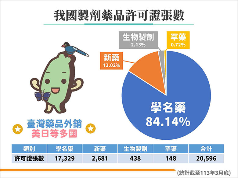 根據台灣食藥署署長吳秀梅的說法,截至2024年3月底,台灣總共有20,596張製劑藥品許可證,其中84.14%為學名藥,共計17,329張。這一數據顯示出學名藥在台灣藥品市場中的主導地位。吳秀梅進一步指出,台灣的學名藥不僅品質優良,還出口到國際市場,並強調:「學名藥的發展有助於強化國內藥品供應的穩定性,尤其是在國際疫情和戰爭等因素影響下,學名藥的彈性供應能確保國內患者的用藥需求不受影響。」